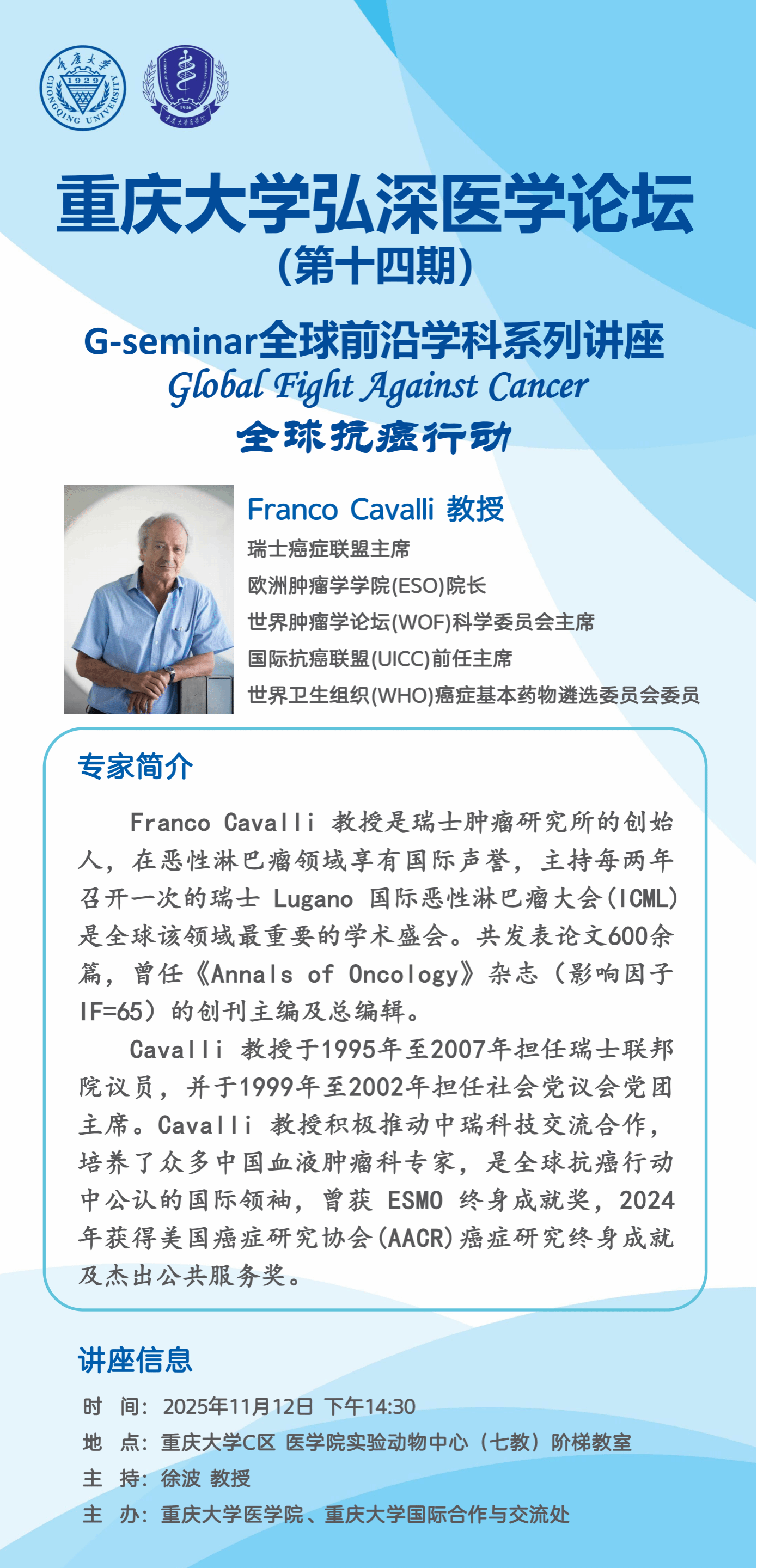 Franco Cavalli 教授是瑞士肿瘤研究所的创始人,在恶性淋巴瘤领域享有国际声誉,主持每两年召开一次的瑞士 Lugano 国际恶性淋巴瘤大会(ICML)是全球该领域最重要的学术盛会。共发表论文600余篇,曾任《Annals of Oncology》杂志(影响因子IF=65)的创刊主编及总编辑。Cavalli 教授于1995年至2007年担任瑞士联邦院议员,并于1999年至2002年担任社会党议会党团主席。Cavalli 教授积极推动中瑞科技交流合作,培养了众多中国血液肿瘤科专家,是全球抗癌行动中公认的国际领袖,曾获 ESMO 终身成就奖,2024年获得美国癌症研究协会(AACR)癌症研究终身成就及杰出公共服务奖。